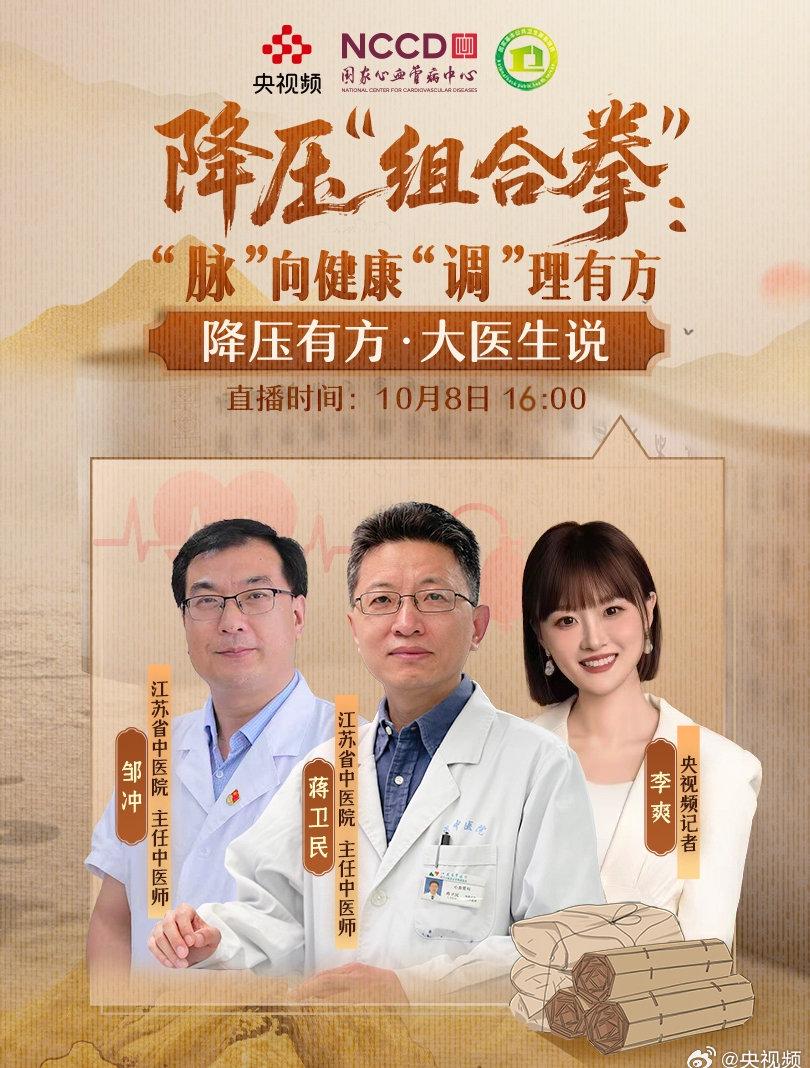 10月8日全国高血压日,江苏省中医院主任中医师蒋卫民、邹冲在央视频《大医生说》直播间为大家答疑解惑。两位专家指出,很多患者对高血压存在认知误区,盲目相信网络偏方反而可能延误治疗。