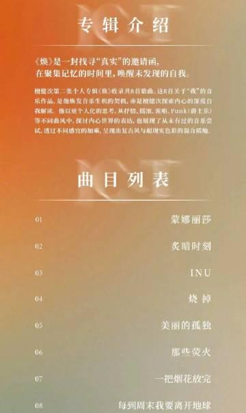 这张专辑的橙色预告海报简直绝了!光影交错的设计特别有质感,一看就是花了心思的。最让我惊喜的是,专辑里居然收录了8首全新歌曲,而且风格超级多元——摇滚、Funk什么都有,这完全打破了大家对檀健次只会唱情歌的刻板印象啊!