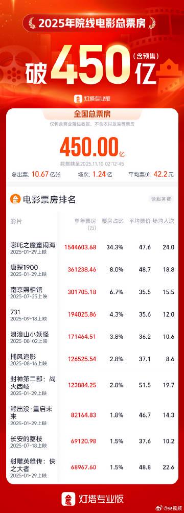 好家伙,2025年的电影市场真是火爆啊!就在11月10日,年度总票房居然突破了450亿大关,这数字看着就让人热血沸腾。想想看,这么多观众走进影院,为中国电影贡献了这么惊人的成绩,不得不说咱们的电影产业真是越来越给力了。