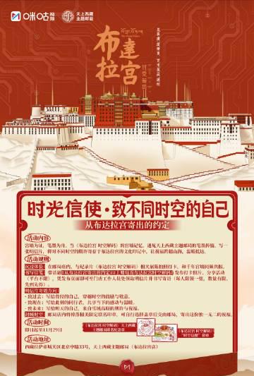 💡如果你恰好在国内,可以直接前往活动现场。拍摄打卡照片带上#从布达拉宫寄出的约定#和#上咪咕看布达拉宫时空解码#两个话题,就能领取限量明信片,写下给未来自己的寄语。每人限领一张,记得早点去哦。